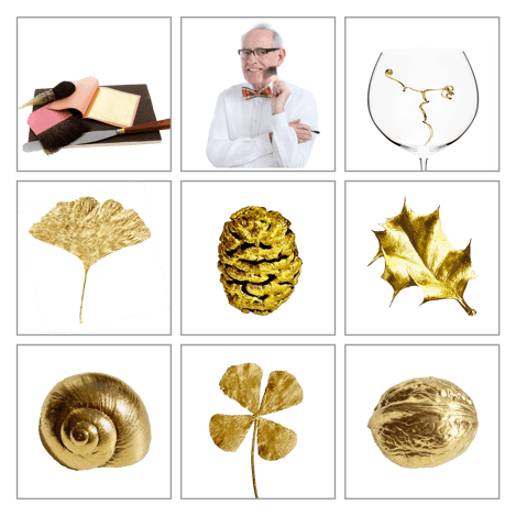 Ausgewählte Naturformen werden mit einem speziellen Haftmittel für das Gold grundiert und anschließend mit feinem 24-Karat-Blattgold überzogen. Das dünne Gold legt sich wie ein sanfter Hauch auf jedes Objekt, betont Linien und Strukturen – und verwandelt Vergänglichkeit in leuchtende Beständigkeit.